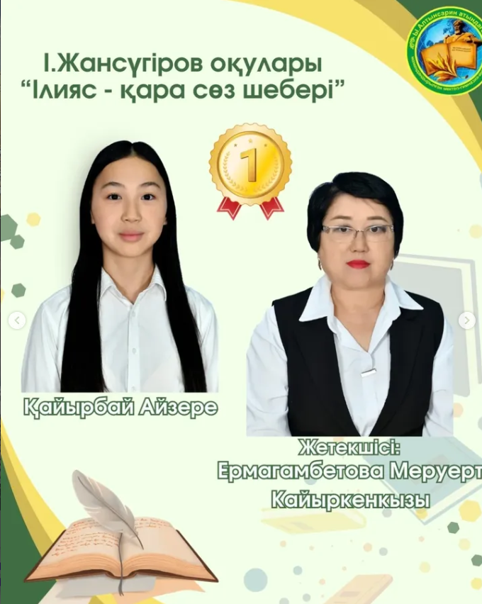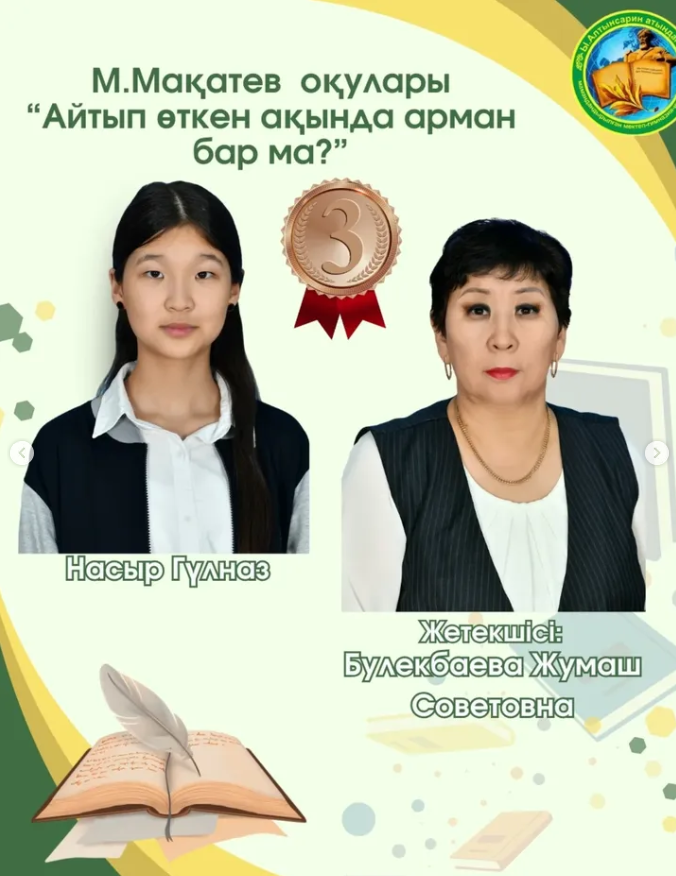 Насыр Гүлназ - "Айтып өткен ақында арман бар ма?" номинациясы бойынша жүлделі 3 орынға ие болды. Жетекшісі: Булекбаева Жумаш Советовна.