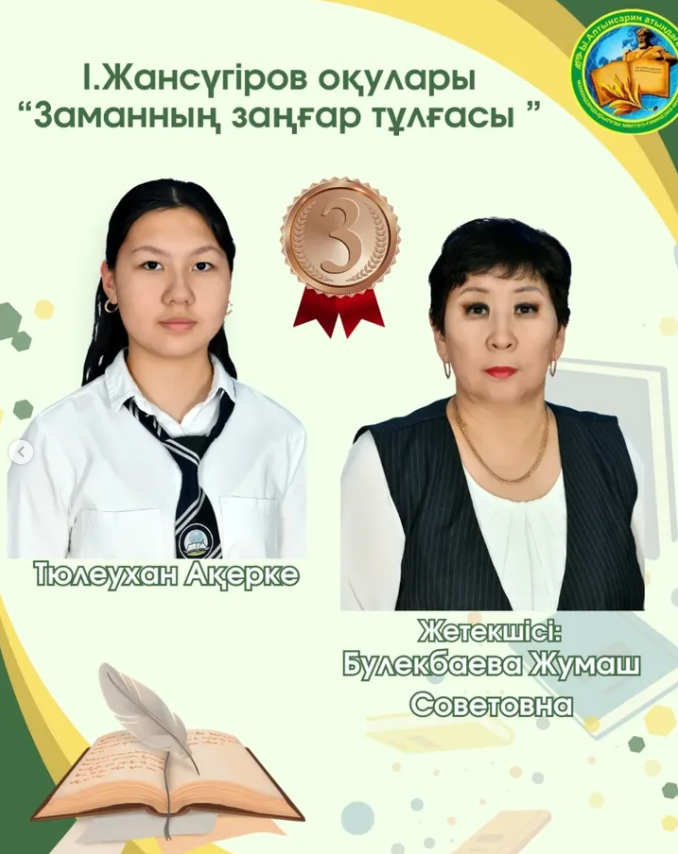 Тюлеухан Ақерке - "Заманның заңғар тұлғасы" номинациясы бойынша жүлделі 3 орынға ие болды. Жетекшісі: Булекбаева Жумаш Советовна.