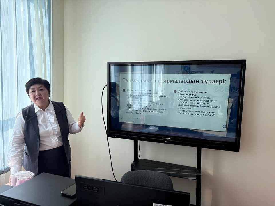 Танымдық тапсырмаларды орындау арқылы оқушылар тарихи оқиғаларды тереңірек түсініп, тарихи деректерді талдауды үйренетінін айтып, оның қажеттелікітеріне тоқталып өтсе, қазақ тілі пәнінің мұғалімі Сальмагамбетова С.А «Қазақ тілі сабағында оқушылардың дарындылық жолдарын ұштастыру» тақырбында баяндама жасады. Өз баяндамасында дарынды оқушылардың қабілетін ұштау – білім беру жүйесінің басты міндеттерінің бірі болып табылатынын айта келіп, дарынды оқушылардың ерекшеліктері мен олардың шығармашылық әлеуетін дамыту жолдарына тоқталып өтті. Олардың қатарында: жылдам ойлау және стандарттан тыс шешім қабылдау қабілеті, қоршаған ортаға деген жоғары қызығушылық,тілдік қабілеттің жоғары деңгейде дамуы, шығармашылық әлеуетінің жоғары болуы, логикалық және аналитикалық ойлау дағдыларының жетік қалыптасуына тоқталып өтті. Өз сабақтарында Сымбат Амангелдиевна оқушылардың дарындылығын ұштастыру үшін бірнеше бағытта жүргізілетінін айтып өтті. Олар:лингвистикалық қабілеттерді дамыту, мәтіндік талдау, шығармашылық эссе жазу, дебат, шешендік өнер сабақтары, зерттеушілік дағдыларды қалыптастыру, жобалық жұмыстар мен ғылыми-зерттеу жұмыстарына баулу, оқушыларды олимпиада мен байқауларға дайындау, әдеби кейіпкерлер бейнесін түсіну және талдау және т.б